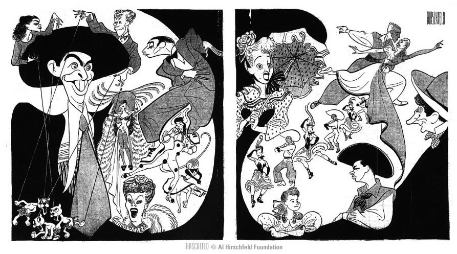 To seven generations of readers, Hirschfeld's name became inextricably connected to Broadway and New York's Big Apple. His vivid illustrations made people reminisce about the plays they had seen, or motivated others to go and attend it. He expressed the thrill of seeing mesmerizing performances, the joy of hearing wonderful songs and the heartfelt emotions a captivating story can bring. Millions of people, all around the world, who never went to Broadway in their entire lives, got their general impression from looking at Hirschfeld's stylish drawings. Jules Feiffer once said that "the only glamor left in the theater is what Hirschfeld brings to it." Hirschfeld chronicled many actors, dancers, singers, lyricists, composers, playwrights and producers. Some later became huge names in the industry. The artist captured countless performances. Since many people who were once involved in the production have passed away, not to mention the theatergoers themselves, there is barely any record left of what these plays were like. Sometimes there are photographs, audio recordings and written reviews available, but for the most part, Hirschfeld's graphic interpretations are nowadays the only visual record theater historians have of these long forgotten stage shows and entertainers. Annually, his caricatures were compiled in books under the title 'The Best Plays of...'. Another compilation of his theater work is 'American Theater: The American Theater as Seen by Al Hirschfeld' (Elm Tree Books, 1977).