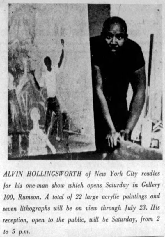 As the 1950s progressed into the 1960s, Alvin C. Hollingsworth began to make his mark as a fine art painter. In the late 1950s, he had documented the many building stages of New York's Guggenheim Museum in a series of paintings. In 1961, he had his first solo exhibition, called 'Exodus', at the Ward Eggleston Gallery in New York City. In addition to another solo exhibition at the Terry Dintenfass Gallery in 1965, Hollingsworth's work was part of group exhibitions at the Metropolitan Museum of Art, the Whitney Museum of American Art, the Rhode Island School of Design, the Boston Museum of Fine Arts, and the Museum of Modern Art in New York. During this period, his artwork also appeared in the publication Manhattan East.
