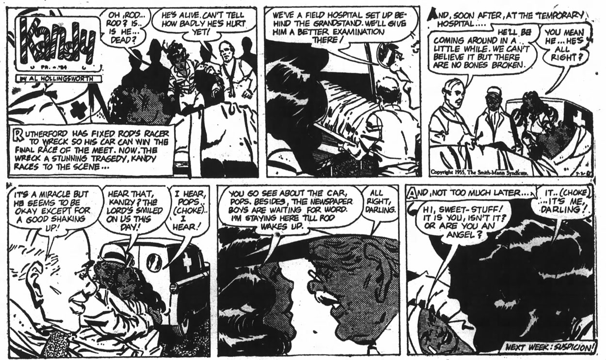 Between 25 September 1954 and 22 October 1955, Hollingsworth had his own Sunday strip 'Kandy'. Distributed to black newspapers through the Pittsburgh Courier/Smith-Mann Syndicate, it was an action-filled romance adventure serial with the backdrop of professional auto racing and corporate espionage, starring the smart, young and independent black woman Kandy MacKay, an engineer, and the black competitive race car driver Rod Stone.