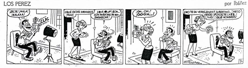 'Los Perez'. Translation: "Yes yes. Oh la la! Oh la la!" - "What are you lookin' at? Give it here!" - "Oh... eh... gulp... those are Madagascarian landscapes!" - "Oh... oh... oooh! Aren't you ashamed, Libertino, dirty old man. Foto's of B.B. (Brigitte Bardot)! Men!"