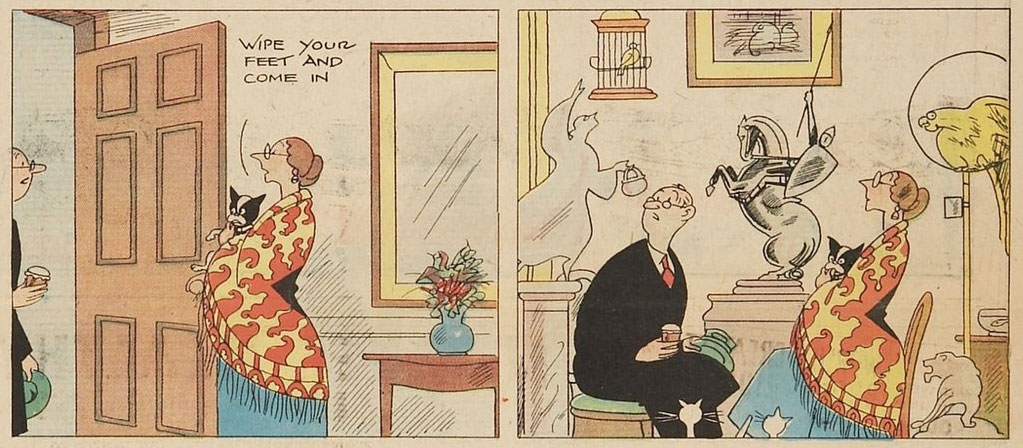 Between 15 June 1930 and 25 October 1936, Rea Irvin created the newspaper Sunday gag comic strip 'The Smythes', which ran in The New York Herald Tribune. Featuring mostly gentle humor, the gags centered around a middle class suburban family, consisting of father John, mother Margie, and their two children, Willie and Maudie. Despite the Great Depression, the family is eager to climb the social ladder, and Irvin gracefully shows them navigate ill-fated dinner parties with pompous socialites, fend off robbers dressed as Santa, and get chased out of restaurants by cleaver-wielding chefs.