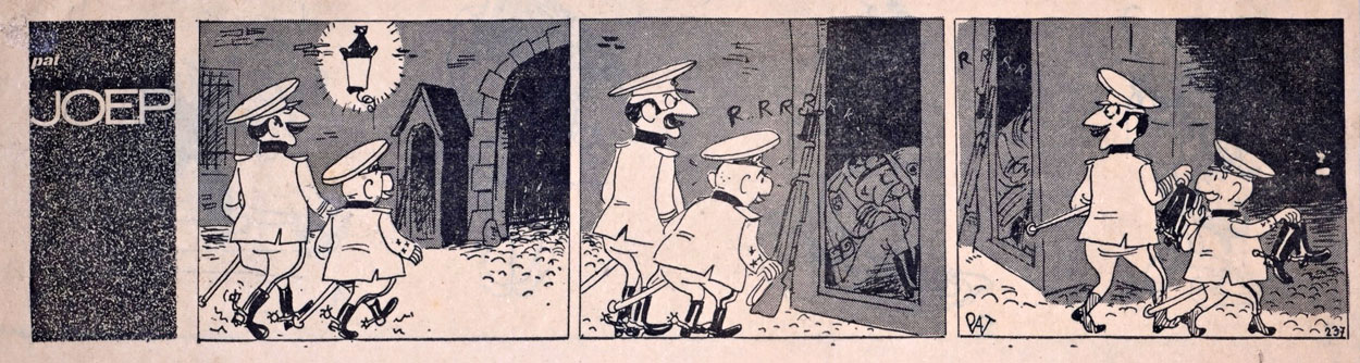 After his prison release in 1951, Jamin was however not able to resume his career. He initially went back to Germany, where he worked for the Ruhr Nachrichten newspaper, making a daily caricature under the name "Peter Klipp". Hiding behind the pen name Alidor, he also became one of the main contributors to the Brussels satirical weekly Pan, traveling back and forth between Germany and Belgium every two weeks. Eventually returning to his home country, Jamin also designed advertisements for Martini and Cinzano Vermouth. Under the pen names Kler and Alidor, his artwork also appeared in the Flemish Catholic opinion weekly De Vlaamse Linie and its follow-up De Nieuwe Linie. He was also the cartoonist behind the pen name Pat, creator of the military humor strip 'Soldaat Joep' (1962-1965). Paul Jamin's cartoons additionally appeared in The Bulletin, Belgique Numéro 1, L'Événement, Impact, Le Métropole, Trends, De Standaard, Ciné-Revue and L'Éventail.