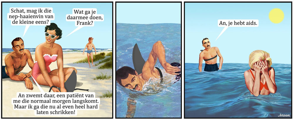 "Honey, can you hand me the fake shark fin of the little one?" "What are you going to do with it, Frank?" "An is swimming there, a patient of mine, who'll come by tomorrow. But I'm going to give her a real scare now!" "An, you have aids."
