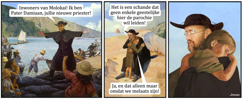 Jeroom strip from the 21 December 2016 issue of Humo. "Inhabitants of Molokai! I'm Father Damien, your new priest!" "It's a shame no other priest wants to lead the parish here!" "Yes, and that only because we are lepers!"