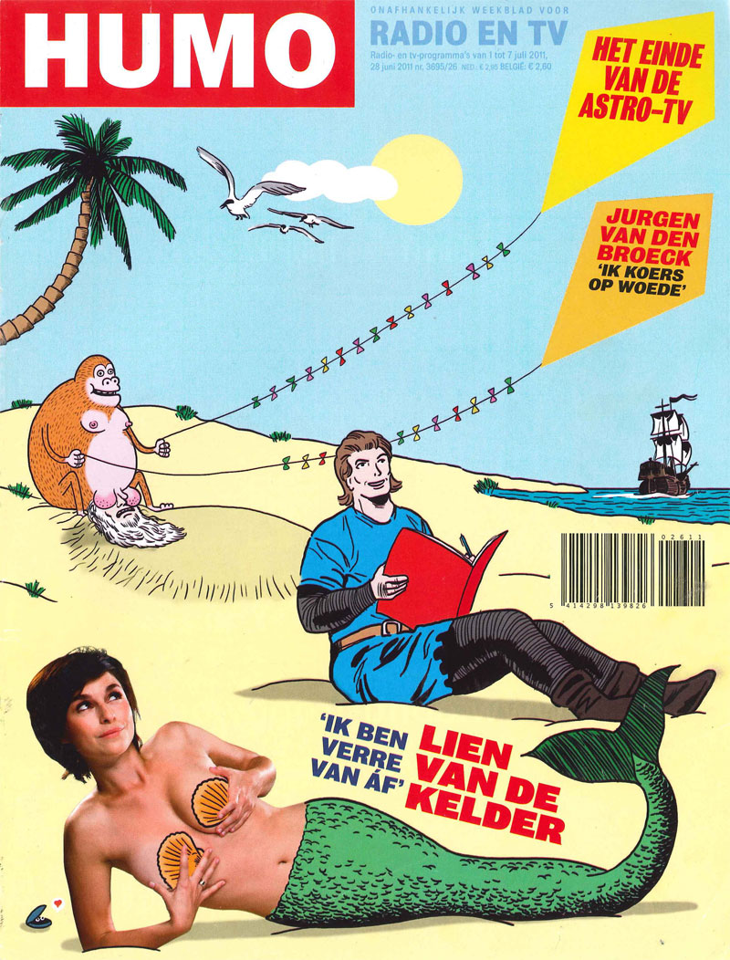 Humo covers of 5 August 2008 (with cameos by Tettenman, Reetman, Willy Vandersteen's Wiske (topless) and Belgian politician Bart De Wever riding a white rabbit, in reference to a real-life candid photograph the press took of him and his son at a theme park ride) and 28 June 2011 (featuring Ridder Bauknecht and a gorilla whose testicles cover Merlin's face, while being buried underneath the sand).