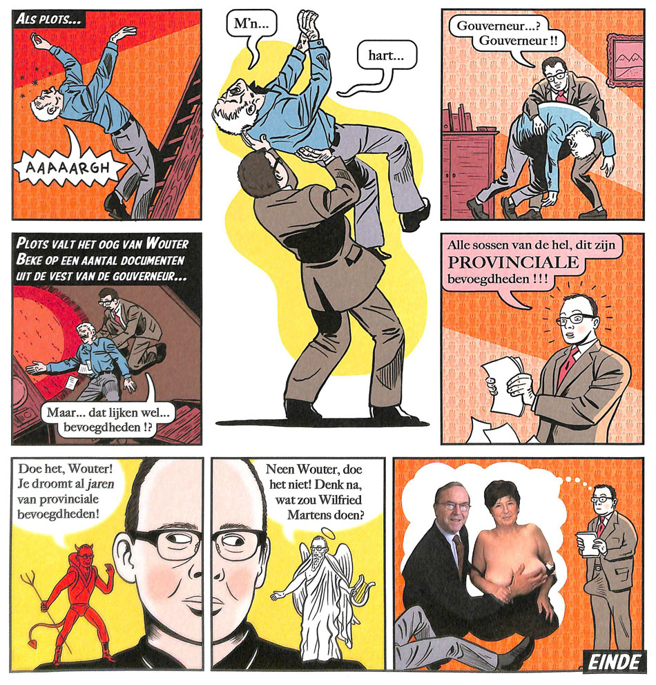 'Wouter Beke' (Humo #3703, 23 August 2011), starring real-life christian-democratic politician Wouter Beke. When a provincial governor dies, he discovers his "provincial warrants" and wants to take them, but his conscience interferes, asking him what legendary head of the christian-democratic party Wilfried Martens "would do"? Beke then thinks about Martens' secret love affair with fellow party member Miet Smet (whom the real-life Martens would later marry).