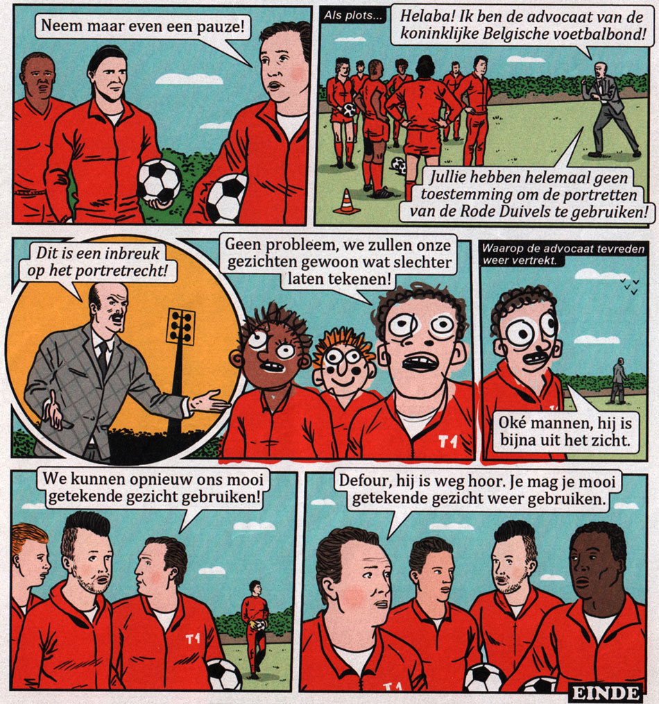 'Rode Duivels' (Humo #3852). The Red Devils make their faces "unrecognizably ugly" to avoid unauthorized use of their likenesses. After the man who complained about it left, football player Steven Defour is told that "he can remove his ugly face again" (with others unaware that it IS his real face).