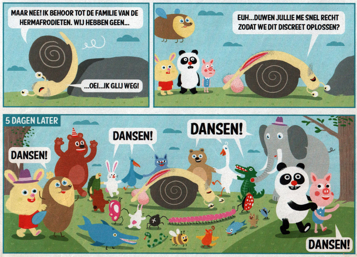 In 2011, Humo's readership met the animals of 'Het Knuffelbos' ("The Cuddly Forest", 2011-2014). This gag comic stars a group of cute forest animals who have an obsession with dancing. Among them are a yellow rabbit, a mole, a panda and a piglet. They often make racist comments, and mutilate or rape other creatures. But whenever somebody complains or cries in agony, they simply yell: "Dansen!" ("Let's dance!") and form a polonaise, ignoring the problem. The concept bears a canny resemblance to the animated web series 'Happy Tree Friends' by Kenn Navarro and Rhode Montijo. 'Het Knuffelbos' was also used in a lot of Humo merchandising, including a smartphone app in which users could fill in their own speech balloons.