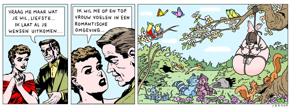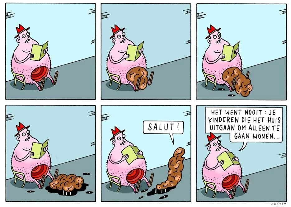 While Jeroom was still a student, his teacher Ever Meulen helped him make his professional debut in the pages of the magazine Humo, where decades earlier Meulen himself had started his graphic career. Starting in January 1998, Humo ran Jeroom's first cartoons and comic strips: typically absurd and shocking comic gags in the tradition of Humo's house cartoonist Kamagurka. After graduation, Jeroom spent one day working at a washing powder factory, but strongly disliked the heavy work and instead increased his involvement with Humo. For eight years, he shared a studio with Kamagurka, who taught him some tricks of the trade. On occasion, the two men collaborated, for instance on a series of gags with 'Ratman', about a man with a dead rat in his mouth. Together with Kim DuchateauNixBart Schoofs and Pieter de Poortere, Jeroom formed a new wave of Flemish absurdists that emerged in the 1990s.