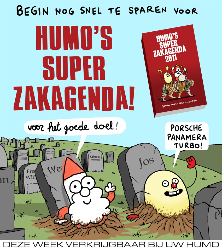 Advertisement for Humo's pocket agenda 2011 starring Jeroom's Joske and Jonas Geirnaert's Kabouter Wesley.