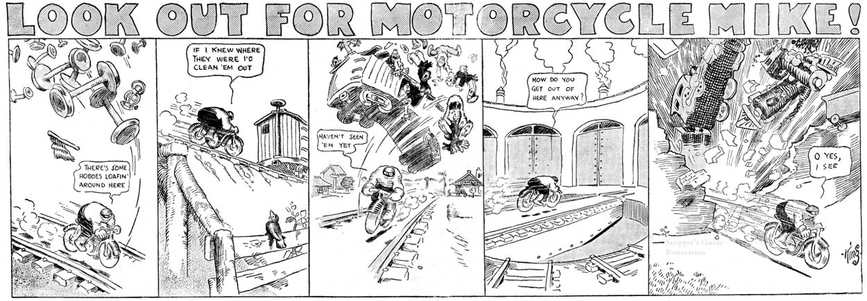 When 'Hi-Hopper' ended, The Chicago Tribune introduced a comics and cartoon section which had been running in its pages for a while, but hadn't received a proper title until that point: The Rectangle. King's one-panel cartoons and comic features were all published in The Rectangle. It featured lesser known series by his hand, such as 'The Boy Animal Trainer' and 'Here Comes Motorcycle Mike', the latter an early anticipation of the superhero genre. Most other cartoons went by titles such as 'Science Facts', 'Pet Peeves', 'A.W.O.L.', 'It Isn't the Cost, It's the Upkeep' and were just made up as they went along.