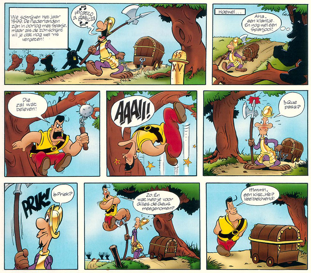In terms of historical drama, De Wit and Kolk modeled 'Gilles de Geus' after Willy Vandersteen's 'De Rode Ridder', though the comedy was obviously inspired by René Goscinny and Albert Uderzo's 'Astérix'. Both comics are set during an important period in their country's national history, both feature local resistance against foreign oppressors, and both make use of puns, historical-cultural references and nods to contemporary society. The fan favorite album 'De Revue', in which Gilles travels to certain locations in the Netherlands, is a homage to the 'Asterix' story 'Le Tour de Gaul' (in English: 'Asterix and the Banquet'). Kolk and De Wit once even directly spoofed the opening of every 'Astérix' story, with the giant magnifying glass on the map setting a village on fire in what turns out to be a nightmare sequence. However, there are differences too. 'Gilles de Geus' sometimes pushes anachronistic jokes into the absurd, with, for instance, nosy artists who try to sketch prince William the Silent, much like modern-day paparazzi try to snap pictures. Gilles and his friends have even used time travel in certain stories.