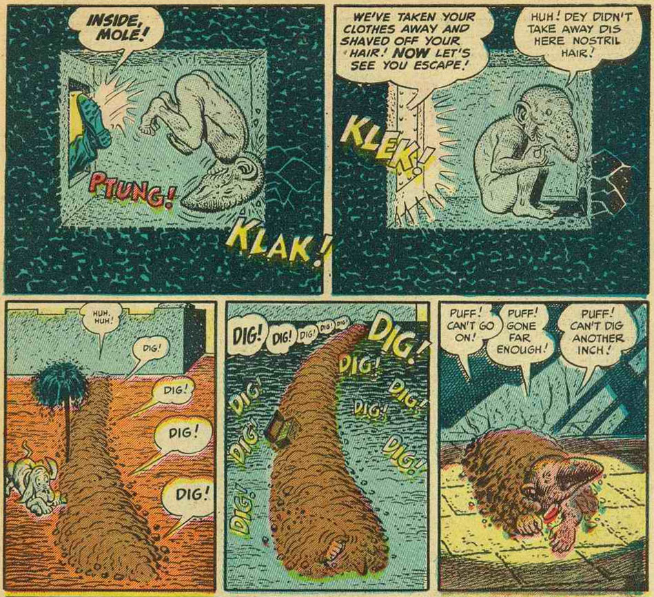 Thanks to Kurtzman, Mad magazine became an all-encompassing satire. He created funny and timeless observations of everyday life, with 'Newspapers!' (illustrated by Jack Davis, issue #16, October 1954), 'Restaurant!' (by Will Elder, same issue), 'Supermarkets' and 'Puzzle Pages' (Jack Davis, issue #19, January 1955). He also created original comics, like the classic 'Mole!' (art by Will Elder, issue #2, December 1952), which features a mole-like prisoner trying to escape jail in the most absurd ways. A straightforward, but nevertheless hilarious gag comic, it was later reprinted in issue #22 (April 1955).