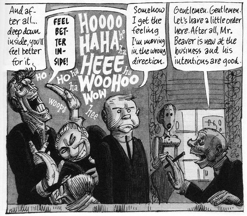 Kurtzman's best known feature in Help! was Goodman Beaver, the naïve everyman he reused from his prior graphic novel 'Jungle Book'. From the 10th issue of Help! (May 1961) on, Beaver was featured in many satirical comics, illustrated by Will Elder. The young idealist typically finds himself in an odd location, asking questions about the madness surrounding him. In one episode he goes to Africa, where he confronts Tarzan with his supposed white colonial attitudes towards the natives. In 'Goodman, Underwater' (May 1962), Goodman meets a Don Quixotesque underwater crimefighter who fights invisible enemies. The entire story is done in the style of Gustave Doré's illustrations of Cervantes' famous novel. Other episodes brought Goodman in contact with Marlon Brando and a disillusioned Superman. In 'Goodman Goes Playboy' (issue #13, February 1962), the teenager meets Archie from Archie Comics who has now succumbed to the Playboy style. Archie and his friends turn out to have signed a pact with "the Devil", AKA Hugh Hefner. As many follow their example, Goodman wonders whether he "should leave to find a place where the dark forces aren't closing in... where honor is still sacred and where virtue triumphs?" But he quickly changes his mind: "Maybe I should sign up."