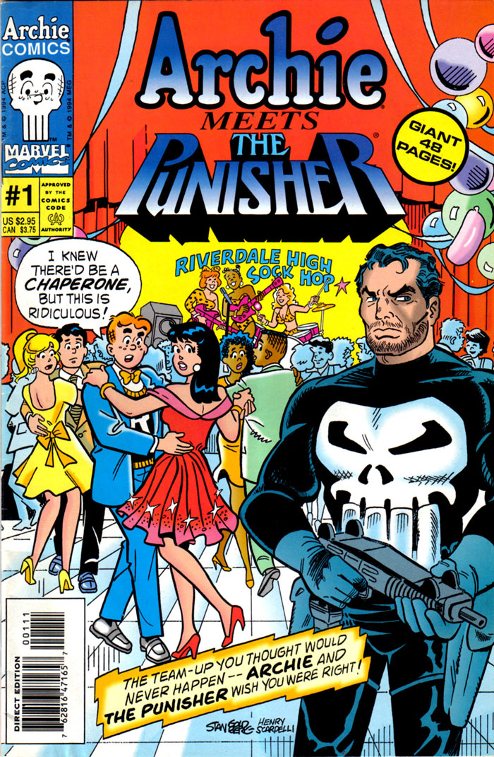 In 1994, Victor Gorelick, editor of Archie Comics, wanted to create a crossover with a Marvel Comics series. When discussing the idea with Batton Lash and writer David Scroggy, he joked that Marvel's vigilante superhero The Punisher might form a swell team with Bob Montana's teenage Archie characters. What started as a joke, eventually became a real publication. 'Archie Meets the Punisher' (August 1994) was written by Lash, with artwork by Stan Goldberg and John Buscema, while Tom Palmer inked, Jack Morelli lettered and Barry Grossman did the colors. The odd premise got a lot of media attention, particularly since both comics were so vastly different in style. The 'Archie Comics' line was one of the most iconic teenage romance comics, and The Punisher a gritty and violent superhero series. While the violence was toned down in 'Archie Meets the Punisher', the plot still involved the characters fighting against drug dealers, something Archie Comics never addressed before in its entire run. Surprisingly enough, 'Archie Meets the Punisher' was both a critical and commercial success. It opened the doors for more crossovers between Archie and other franchises, such as 'Archie Meets Kiss' (Alex Segura and Dan Parent, 2012), 'Archie vs. Predator' (Alex de Campi, Fernando Ruiz, 2012), 'Archie Meets Glee' (Roberto Aguirre-Sacasa and Dan Parent, 2013), 'Archie vs. Predator' (Alex de Campi, Fernando Ruiz, 2015) and 'Archie vs. Sharknado' (Anthony C. Ferrante and Dan Parent, 2015).