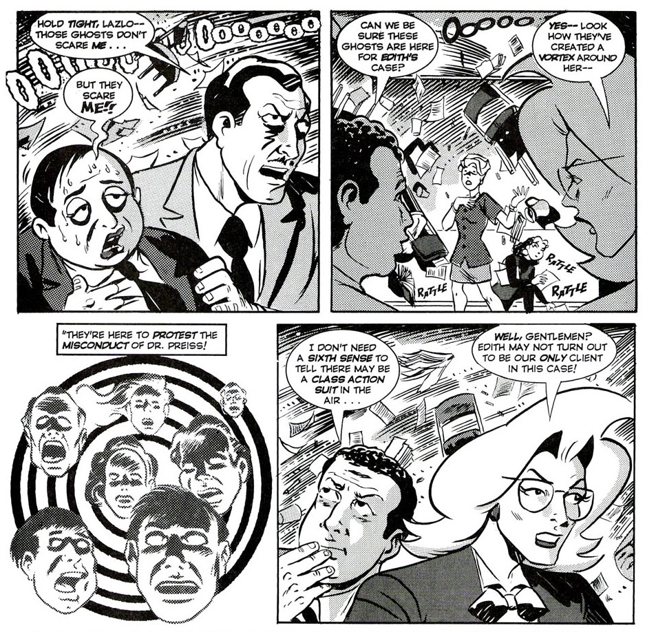 Graphically, 'Wolff & Byrd' was a throwback to 1950s comics like Archie Comics and the E.C. horror title 'Tales From the Crypt'. Lash enjoyed referencing old horror stories and throwing in puns. At the same time, the series was also a witty satire of the justice system. The contrast between the seriousness of the legal profession and the outlandish nature of these horror creatures proved a masterstroke. Situations are often driven to their absurd extremes. In 'Zombie Wife', a man kills his wife, but she turns into a zombie and sues him for murder. It turns into a tough case, since the legal defense questions whether an undead person can claim to have been "murdered". In 'I'm Carrying Satan's Baby', a woman wants to perform an abortion, but without consent of her husband, since he is no longer able to think for himself, having sold his soul to the devil. 'Wolff & Byrd' invited to repeated reading, as many background gags and double layers are sprinkled along the series.
