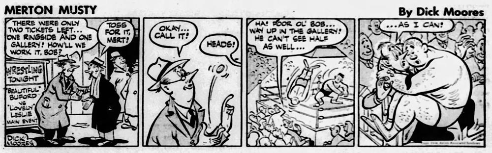 During the period 1948-1953, Moores created the equally obscure comical newspaper feature 'Merton Musty', which appeared in a couple of California newspapers. The 1948 episodes have a copyright notice for the unknown "Artists Associated Syndicate", but it could be a Telecomics production as well. The strip was apparently part of a series of newspaper strips moonlighted by Disney studio artists and animators as a side project. Other features included were 'Holly Wood' by Gil Turner, 'Milford Muddle' by Jack Bradbury and/or Ray Patin, 'Pam' by Gus Jekel, 'Sleepy Holler' by Jerry Hathcock, 'Animal Antics' by Bob Dalton, 'Sidetrack' by Dick Shaw, and a humor panel by Bob Karp. The author of 'Life with a wife' ("Mitchell") is still not known. Also featured was 'Pepe', most likely the Mexican comic strip 'Pedrito' by William de la Torre ("Will"). Some late 1950 episodes of 'Merton Musty' are drawn/signed by a certain "James".