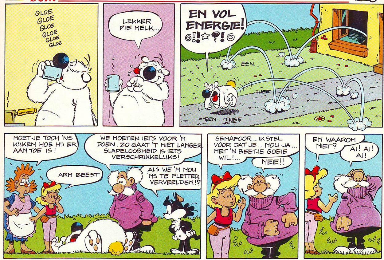 Dommel/Cubitus story for the first issue of Dommel magazine (1989). In line with the popular animated TV adaptation of the comic, animated characters exclusive to the TV show (Miss Beatrix and Chérie) were given large roles in the comic.