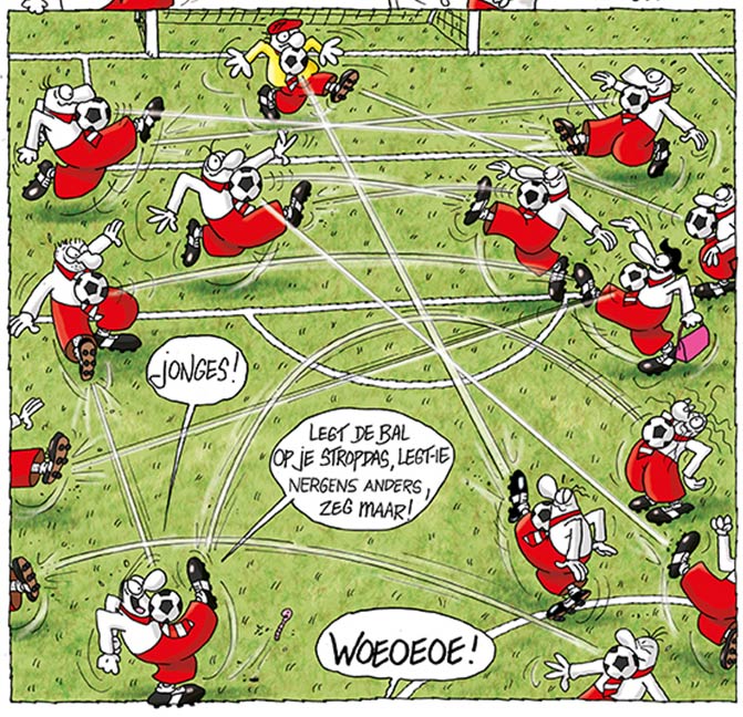 Through De Vrijbuiter, Nicholson also became an assistant and ghost artist for comic artist Toon van Driel. In the early 1980s, Van Driel sold the rights of his popular soccer comic 'F.C. Knudde' to the publisher, and Nicholson became responsible for most of the artwork in the F.C. Knudde magazine (1981-1984). Nicholson also assisted Van Driel on his other comics, including 'De Stamgasten', 'De Kanjers' and the celebrity comic about Dutch comedian André van Duin for Veronica Magazine. Since 1988, Nicholson has been working through his own studio Nicholson Illustraties. He has continued to work with Van Driel in later years, most notably on the 'Knudde' album 'Knudde Naar 't WK!' (2018), which appeared at the occasion of the 2018 World Championships. While the lay-outs were done by Van Driel, Nicholson applied a more polished technique for the finished artwork. It was also the first 'F.C. Knudde' album that credited Nicholson on the cover.