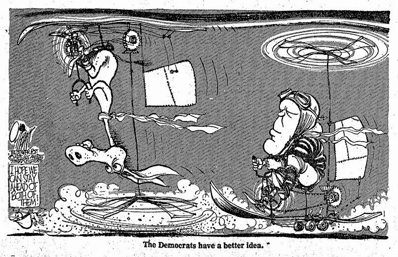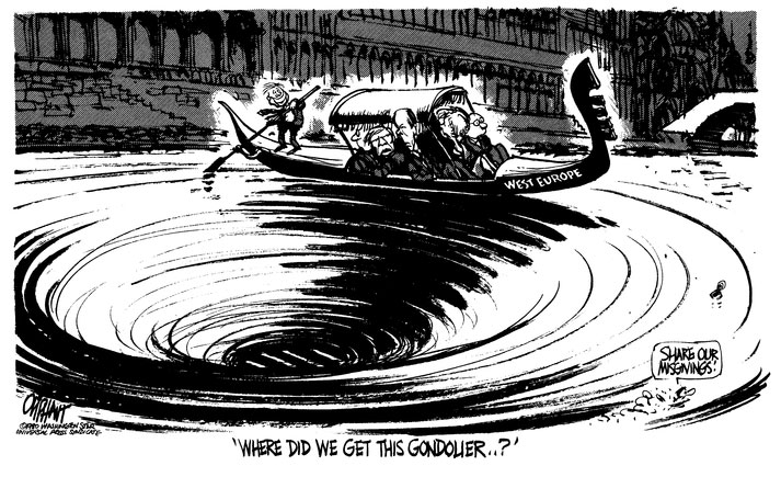 Pat Oliphant cartoon of 23 June 1980, referencing West-European politics. In the gondola is West German chancellor Helmut Schmidt, French president Giscard d'Estaing and U.K. Prime Minister Margaret Thatcher;
