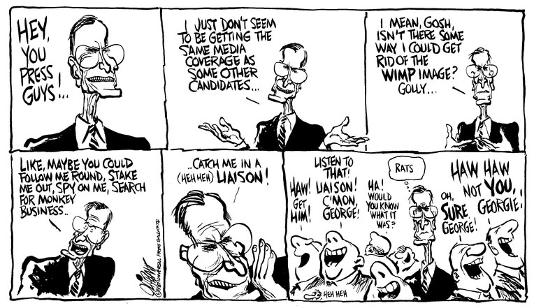 To Oliphant, a comic strip lay-out made it possible to communicate more ideas with the reader. The cartoonist could present a current event in a gag strip narrative. The extra panels allowed for different visual angles and perspectives. By using real-life people as comic characters, Oliphant could go beyond caricaturing just their physical features. He could exaggerate their public image too. Richard Nixon, for instance, became a brooding, sinister figure. While most other cartoonists focused on Nixon's large nose and cheeks, Oliphant took a more minimal approach. He simply portrayed "Tricky Dicky's" eyes, keeping the rest of his face out of frame, while maintaining the politician's ominous appearance. Gerald Ford, who had a reputation for clumsiness, became an awkward twit under Oliphant's pencil. He famously depicted him with a permanent Band-Aid on his forehead. Jimmy Carter, widely regarded as a weak leader, gradually shrunk in size. After Carter was attacked by a river rabbit, Oliphant made it a running gag to let him be stalked by bunnies, even long after Carter's active political career.