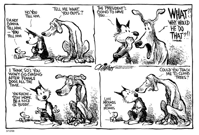 Pat Oliphant cartoon of 12 March 1998 starring Socks, the presidential cat of U.S. President Bill Clinton. The cartoon refers to the 1998 Clinton-Lewinsky sex scandal.