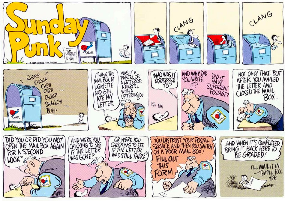 On 18 March 1984, Oliphant launched a Sunday comic titled 'Sunday Punk'. It featured Punk in gag situations, inspired by the political events of that week. While the comic was well-received, it was in many ways barely indistinguishable from his daily political cartoons, which also featured comic strip panels. The only genuine difference was that Punk now actually had a starring role, instead of being a Greek chorus in the background. Oliphant eventually discontinued 'Sunday Punk' on 16 September, because creating it was too time-consuming.