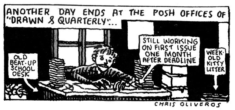 During his last semester at Dawson College in 1989, Chris Oliveros started the comic publishing company Drawn & Quarterly, based in the Mile End neighborhood of Montreal. Inspired by Art Spiegelman and Françoise Mouly's <a href="/magazines/raw.htm">RAW</a> magazine, he borrowed 2,000 dollars from his father to produce the first issue of the anthology magazine Drawn & Quarterly, which appeared in April 1990. Until December 1992, a total ten issues appeared, containing work by a new wave of international alternative cartoonists. New series of the Drawn & Quarterly title appeared in the periods 1994-1997 (six issues) and 2000-2003 (3 issues), followed by the Drawn & Quarterly Showcase series (5 isuses, 2003-2008), which offered greater visibility to upcoming creators.