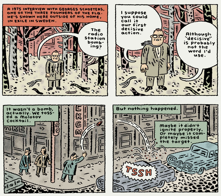 By 2023, what he sees as his first "real" book was published by Drawn & Quarterly: 'Are You Willing to Die For The Cause?'. A French-language translation, 'Mourir Pour la Cause', was published at the same time by Les Éditions Pow Pow. The book focuses on the exploits of the Front de Libération du Québec, a series of revolutionary groups in the 1960s that tried by various means to overthrow the Canadian government. In 2024, the book was nominated for an Eisner Award and was the winner of the Bédélys Award for best comics album in Quebec. In addition, it was a "Sélection Officielle" at the 2025 International Comic Strip Festival in Angoulême, France.