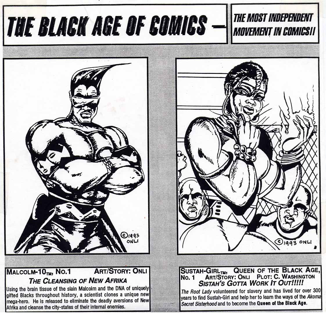 Advertisement for the Black Age of Comics, featuring Malcolm-10 and Sustah-Girl, 1993.