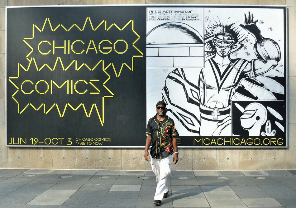 In 1979, Onli's recurring character NOG made its debut in the weekly The Chicago Defender. NOG is a dreadlocked African-American superhero, whose name stands for "Nubian of Greatness". NOG fights against injustice in outer space, to defend his black planet. The character appeared in three graphic novels, 'NOG, Protector of the Pyramides' (1981-1982), 'NOG is Back!!' (1994) and 'Nog Nu!!' (2011). Onli self-published the comics and sold them at art fairs and in head shops. While he sometimes offered his stories to mainstream publishers, the editors often had trouble understanding that NOG wasn't a typical DC or Marvel superhero and couldn't follow the afrofuturistic themes. Even compared to established African-American superheroes like Luke Cage and Black Panther, NOG fought different kinds of battles and had other messages.
