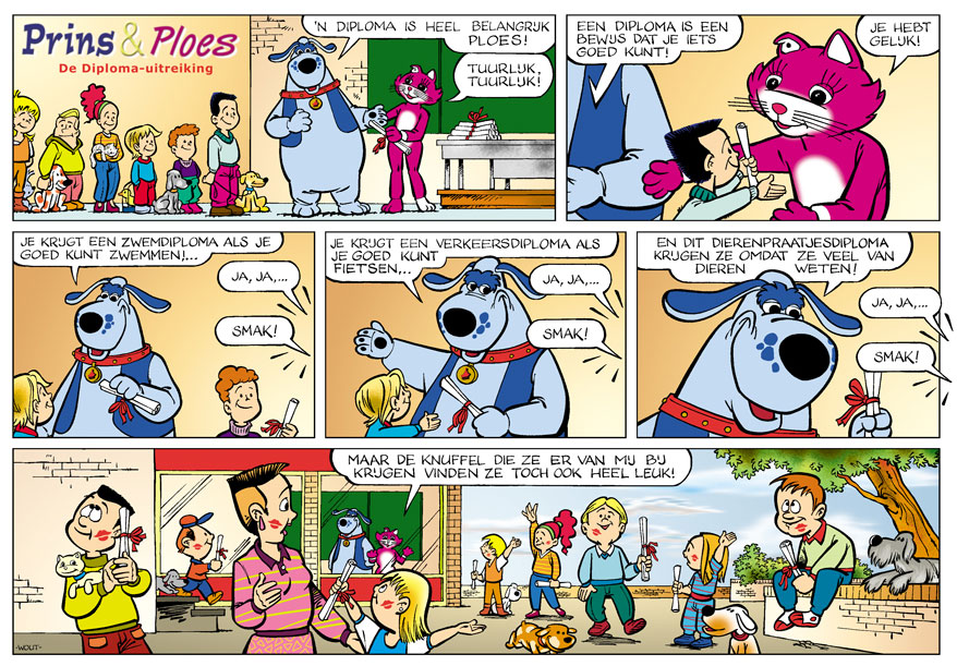 Working as a professional cartoonist and illustrator since 1983, Wout Paulussen first ventured into mainstream comics at the Oberon children's magazines. Between 1984 and 1987, he drew three short stories with Walt Disney's 'Bucky Bug' for the Dutch Donald Duck weekly. With 136 episodes of his own creation 'Heleentje' (1985-1991), a family gag comic about a quickwitted little girl, he was a regular contributor to the girls' magazine Tina. For the youth magazine Pauze, distributed freely at high schools by Pauze Media Exploitatie, Paulussen created the comic 'Bolletje & Co' (1988-1989).