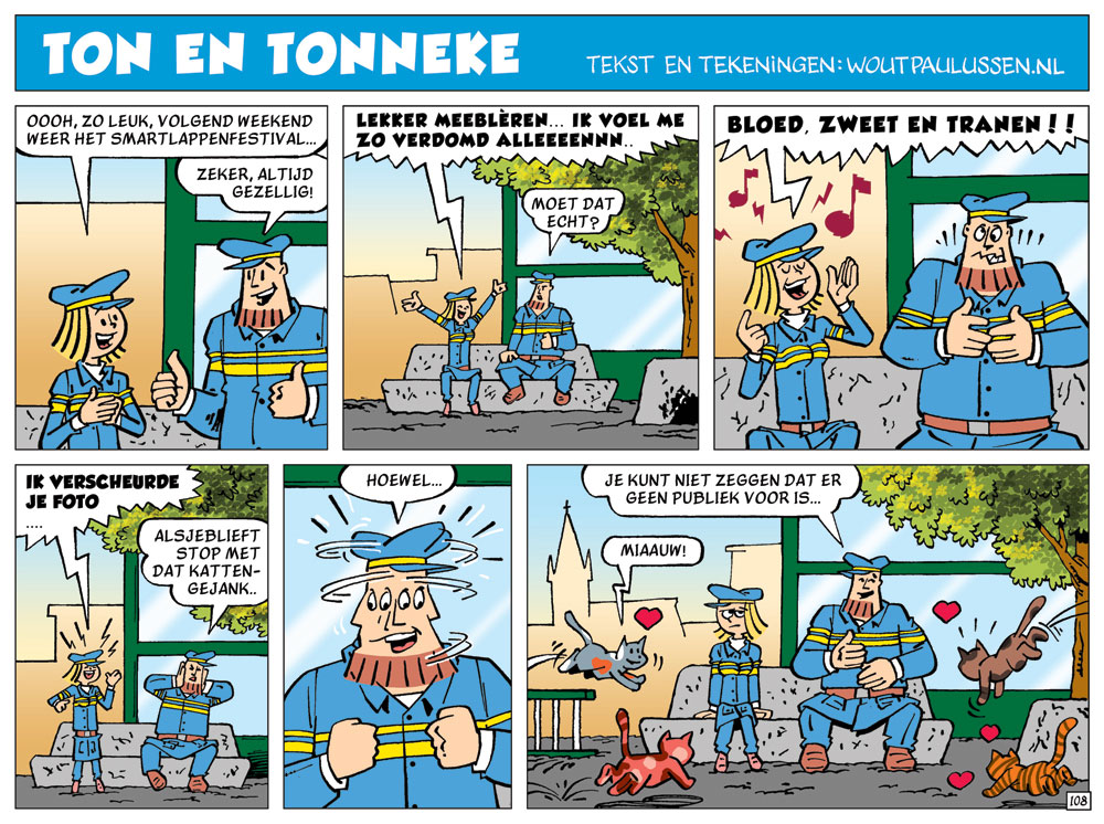 In 2020, the free bi-weekly local newspaper MijnGazet was launched in Sittard, to which Wout Paulussen has contributed the comic strip 'Ton en Tonneke' (2020- ). Through the characters of two enforcement officers, Paulussen has used his comic strip to comment on the local news. The comic's name is a tribute to 'Ton en Tineke', the Dutch title of André Franquin's classic 'Modeste et Pompon' comic. In 2025, a first landscape-format book collection was released. For the monthly regional newspaper FFniks, he has additionally created the 'Flip & Floortje' cartoon panel (2024- ).