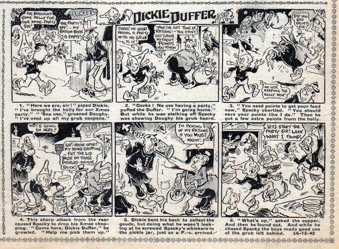 During World War II, in 1942, Charlie Pease was drafted, but discharged because of his rheumatism and arthritis. Instead of the army, he joined the Home Guard (AKA "Dad's Army"), a citizen militia that stayed at home to train and prepare for a possible enemy invasion. After the war, Pease remained active for the Amalgamated Press, but since the company suffered from post-war paper shortages, he supplemented his income by working for smaller publishing companies as well. Pease appeared in the Martin & Reid magazines Merry Moments (with 'Wishful Winnie', 1948) and Jolly Adventures (with 'Charlie the Super Sheriff', 1949). Merry Maker - a magazine published by John Matthews - featured his comic strip 'Ned Nightlite' and Philmar's Look and Laugh magazine had Pease illustrations and the 'Down But Not Out' (1949) feature.