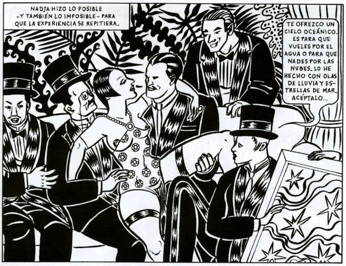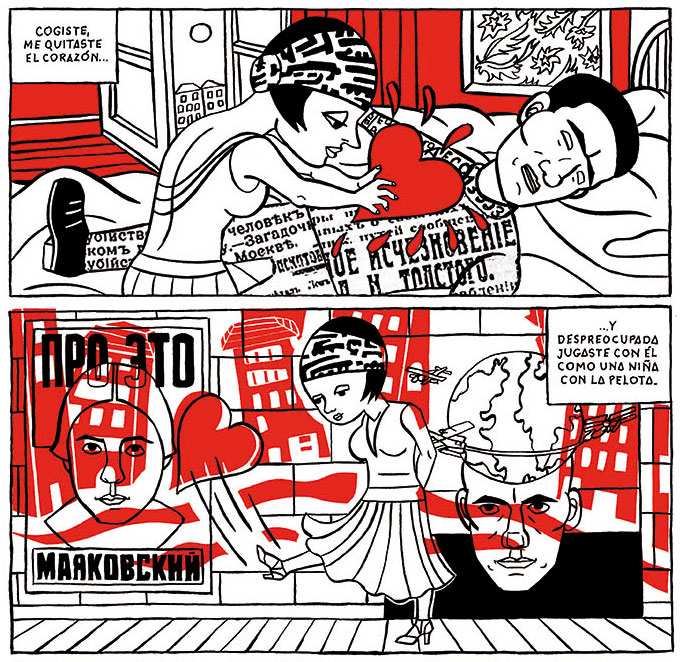 Pérez Vernetti has furthermore made graphical adaptations of works by literary masters such as Guy De Maupassant, Franz Kafka, Dylan Thomas, Jack London and Colette. While many of her early works have dealt with eroticism, she has been mostly steering away from the subject since 2011. From then on, she has been pioneering the genre of "graphic poetry" in her country. She has published books about the life and works of different poets with the publishers Luces de Galibo and Reino de Cordelia S.L., including 'Pessoa & CIA' (about the Portuguese poet Fernando Pessoa, 2011), 'El Caso Maiakovski,' (about the Russian poet Vladimir Maiakovski, 2014), 'Poémic' (about the contemporary poetry of Ferran Fernandez, 2015), 'Yo, Rilke' (about the Czech poet Rainer Maria Rilke, 2016) and 'Viñetas de Plata' (2017, about the Spanish poet Luis Alberto de Cuenca). For the Provincial Council of Malaga, she adapted poems by eight Spanish contemporary poets in 'Ocho Poemas. Novela Gráfica' (2016).