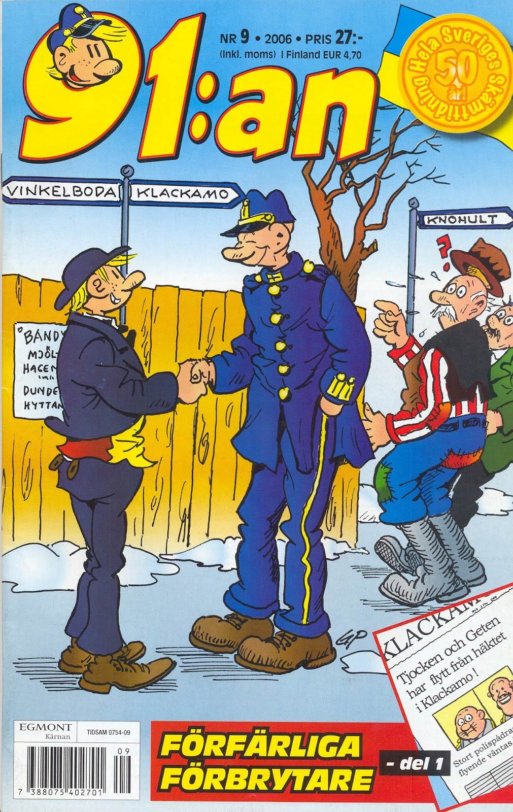 When Persson took over 'Kronblom' he had big shoes to fill. Elov Persson's lanky sexagenarian from the fictional country village Vinkelboda was already firmly rooted in Swedish pop culture. His name and image have become synonymous with a laid-back life.Gunnar Persson expanded the 'Kronblom' universe with new characters like neighbor Svängrot, and a foster son called Boris. He dropped most of the original philosophical elements, and focused more on humor. Both Rolf Geschwind and Jonas Persson wrote some of the series' scripts in the 1980s. Gunnar Persson continued 'Kronblom' for over forty years, eventually surpassing his father in terms of production. He not only provided the bi-weekly 91:an with episodes, but from 1987 on also the weekly magazine Allers. An attempt to give Kronblom his own magazine in 1997 stranded after only four issues, however. Kronblom also became the mascot of the Swedish association football team Örebro SK in 1987. At a rough estimate, Persson has drawn about 7,000 'Kronblom' pages. This didn't keep him from helping out Nils Egerbrandt with 91:an's title comic. Nowadays the strip is produced by a team of artists and writers, but in 1969 Egerbrandt was solely responsible for its production, yet the editors demanded a steady supply of stories. Persson helped out with the plots and sketching of the adventures of 91:an and the other recruits in the Klackamo base during the 1970s and 1980s. Between 1984 and 2000 he also drew the spin-off strip 'Ur Klackamo Dagbok' ('Klackamo's Diary'). This comic strip version was also syndicated to Swedish newspapers like Hallandsposten through Bulls Press.