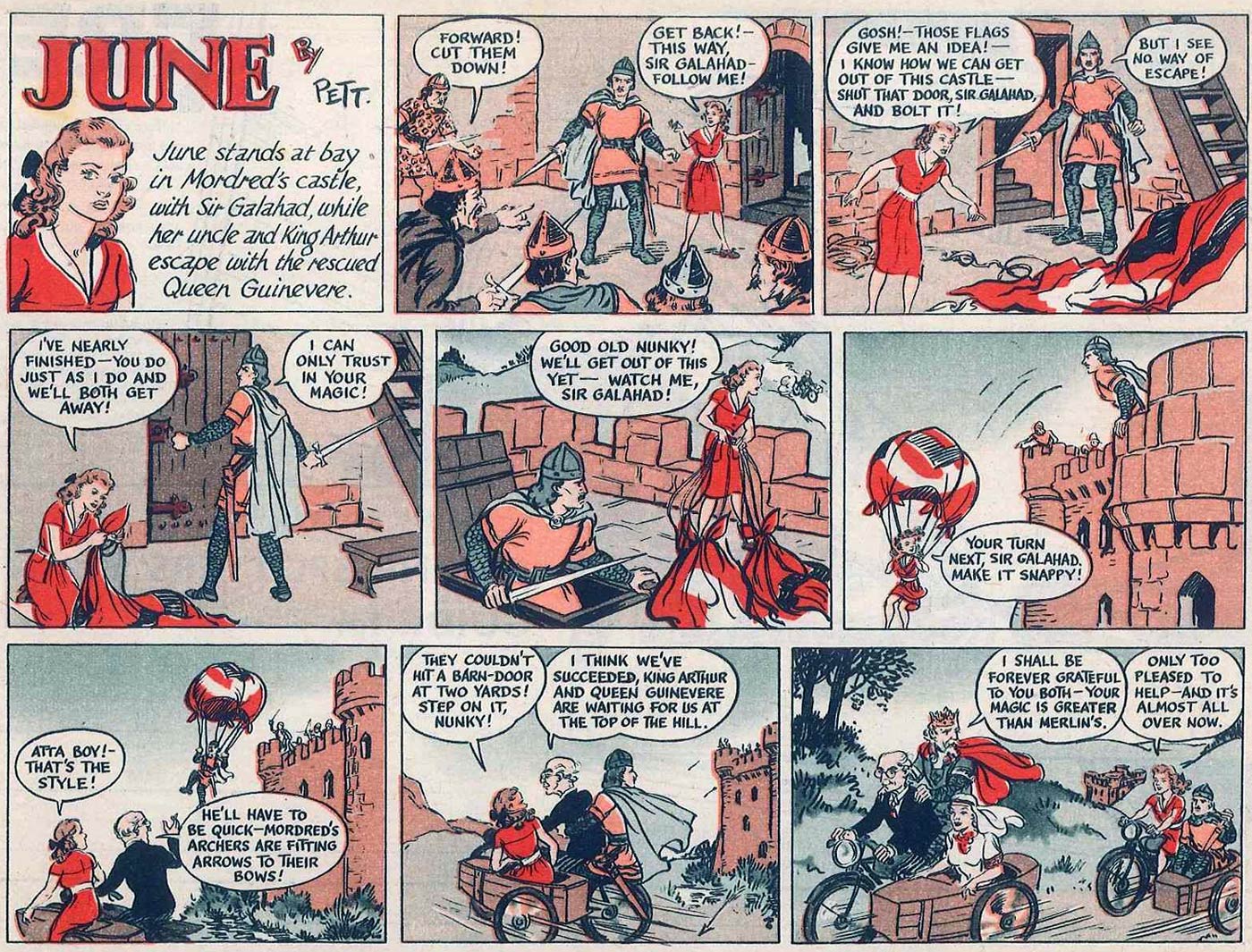 In 1948, Pett drew a comic book adaptation of the Warner Bros swashbuckler film 'The New Adventures of Don Juan' (1948) starring Errol Flynn. He also contributed to some of the weekly comic magazines by the Amalgamated Press. For Comet he drew 'June' (1949), an adventure comic about a 20th-century girl who time travels to the Middle Ages, where she joins King Arthur and Sir Galahad. Pett illustrated 'Cardboard Cavalier' (1949) and the final installments of Reginald Heade's realistic comic 'The Captain from Castile' (1949) for Knock-Out. In 1951, Pett also drew 'Penny Wise' (1951), published in the girl's magazine Girl.