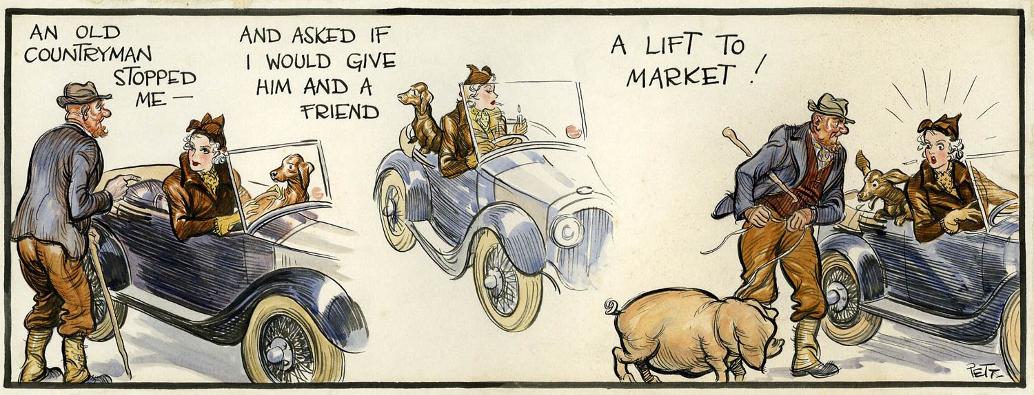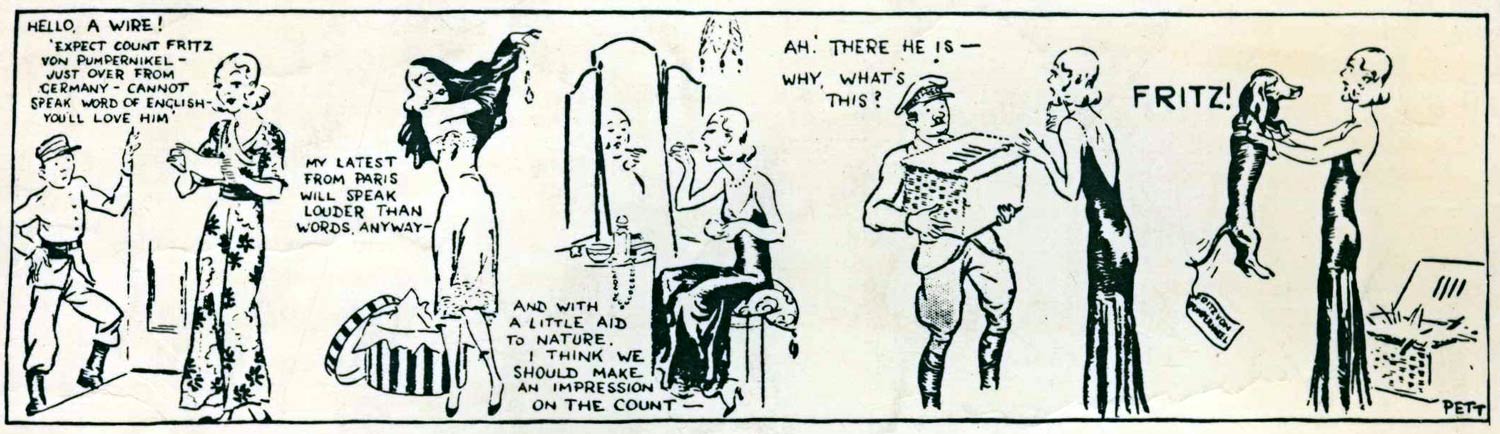 On 5 December 1932, Pett launched his signature series: 'Jane's Journal, the Diary of a Bright Young Thing', which appeared in the newspaper The Daily Mirror. The chief editor instructed him to create a series that could reach the same popularity as Bertram Lamb and Austin Bowen Payne's funny animal children's comic 'Pip, Squeak and Wilfred', though aimed at an adult demographic. Within less than a decade, Pett achieved his goal. 'Jane' became one of the most widely read British newspaper comics of its time. The series stars a pretty young blonde, Jane Gay, who often finds herself in embarrassing situations. The original comic strip was comparable to a daily gag comic, with a clear punchline in the final panel. Just like the title implies, Jane's adventures were presented as a daily journal, with her handwritten entries being combined with Pett's drawings. The original cast was minimal. Jane had a steady boyfriend, Georgie Porgie, and a little black dachshund, Fritz, inspired by Pett's own pet. In the early years, Pett let his own wife pose whenever he had to draw Jane.