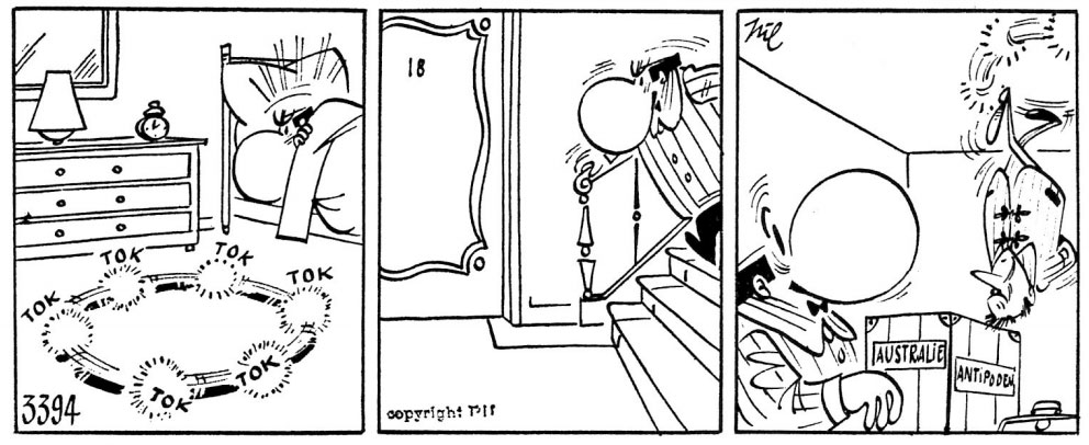 Pil's most famous comic strip is 'Meneerke Peeters', which ran in De Standaard from 7 January 1957 until his retirement on 1 October 1983. The main character is a little mustached man with a colossal nose - even bigger than his head - and with one of most common family names in Flanders. However, Pil based his character on an archaic Flemish expression, "meneerke Peeters" ("little mister Peeters"), used to address people one couldn't take too seriously. 'Meneerke Peeters' was a pantomime comic strip, usually counting about three or four panels. Over a period of 26 years, Pil drew 7,008 gags. Given their lack of dialogue, they could have been easily seen in publications abroad. However, 'Meneerke Peeters' only ran in the French-language Belgian newspaper La Dernière Heure. In 1972, Heideland-Orbis brough out one compilation book: 'Meneerke Peeters. Stop-comics van Pil'. Decades later, a new compilation book was released by the Mercatorstripbeurs: 'Non-Sense Story' (2005).