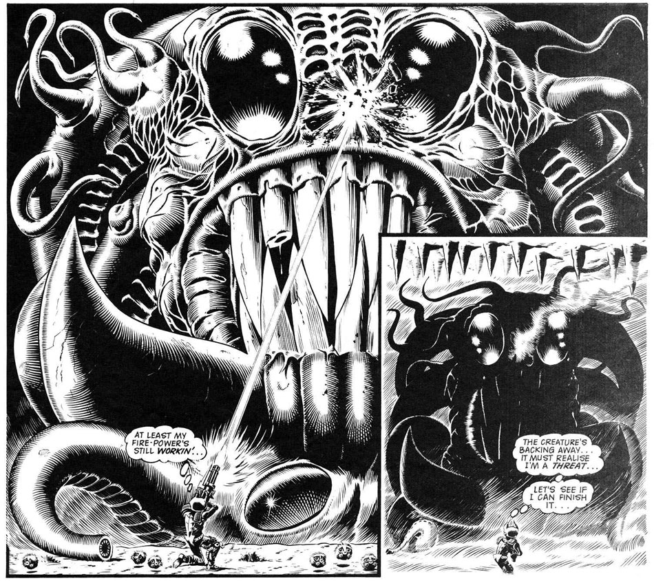 Born in Wales, David Pugh loved reading Eagle magazine as a child. Interviewed by W. Scott Crawford on his blog platformhub (13 July 2019), he vividly remembered noticing his first issue at age 9 or 10, while waiting in the doctor's office. He was enthralled by Frank Hampson's 'Dan Dare', particularly Dan's archvillain The Mekon. His mother snatched the comic away, warning that it would give him nightmares, but Pugh replied that he "wanted nightmares from this." While she never bought Eagle for him, he was allowed to read other comics magazines, such as Boys' World and Ranger. Among his earliest graphic influences were John M. Burns, Frank Bellamy and Don Lawrence. Pugh received his graphic education in Art College at Brighton and Kingston upon Thames, where he discovered different kinds of comics, namely by Marvel artists Neal Adams, Jim Steranko and Jack Kirby. He was very interested in their more experimental lay-outs. Through a friend he also received a copy of the French magazine Métal Hurlant and was shocked by Jean Giraud and Philippe Druillet's visionary artwork. Later in his career he also expressed admiration for Geof Darrow and Frank Miller.
