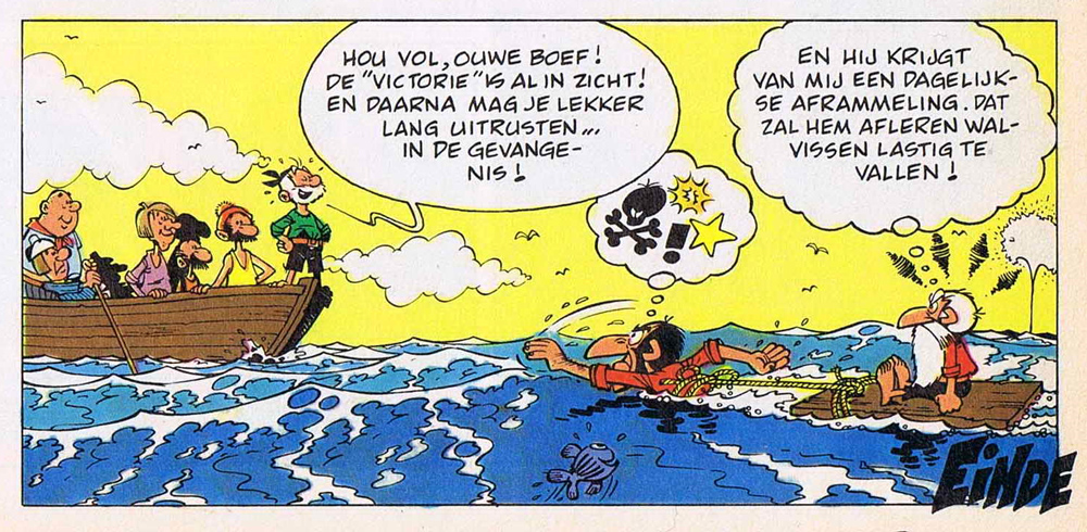 Full of energy, the old man led his crew on missions against pirates for decades to come. In the story 'Dans la Gueule du Dragon' (1961) the lisping harpooner Sébastien became Nick's regular sidekick. Old Nick's appearances in his own series however became more and more scarce over the years. His role at the center stage was gradually taken over by his arch enemy. The pirate Barbe-Noire (real name Saturnin Tromblon) was introduced in the fourth story, 'L'Île de la main Ouverte', serialized in Spirou from 24 March 1960 on. Despite the name, Remacle's "Blackbeard" shows very little resemblance to his historical namesake. Grumpy, highly volatile and plagued by a childish nature, the pirate's antics hardly lead up to anything, especially since Vieux Nick continues to cross his paths. This all to the despair of his grandpa ("Bon-Papa"), who envisioned his grandson to become the greatest pirate of all. Introduced in 'Les Mutinés de la Sémillante' (1960), Bon-Papa accompanies Barbe-Noire on all his missions, regularly slapping his offspring with a "corrective tap". As Remacle gradually began to draw Barbe-Noire taller, the pirate's wits quickly diminished. In the end, the interactions between Bon-Papa and his grandson bring to mind Joe and Averell Dalton from Morris' 'Lucky Luke' series.