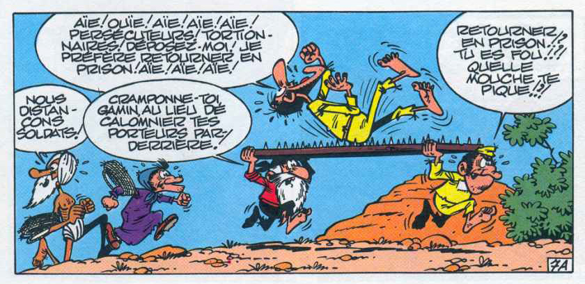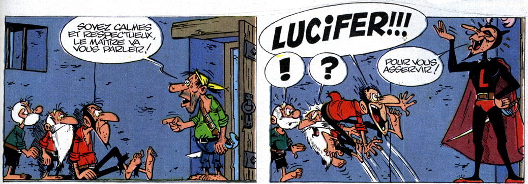 While the 1960s were a remarkably fruitful period in Marcel Remacle's career, by the early 1970s much of his inspiration seemed to have dried up. He relied on the help of Marcel Denis for several 'Barbe-Noire' episodes, and also Maurice Tillieux stepped in to write the stand-out episode 'La Prise de Canapêche' (1971). In this story, Barbe-Noire shaves his beard and disguises himself as a student of the boarding school Saint-Remacle, in order to infiltrate the wealthy and fortified city of Canapêche. His attempts to escape the strict regime and classes of the school are considered by many as the funniest moments of the entire series. While Remacle then continued to write his own scripts, he alternated the longer episodes with short, humorous stories. Many of these shorter installments dealt with Barbe-Noire's attempts to escape from prison, often accompanied by the childlike fellow inmate Hercule, who has his auntie on the outside as an accomplice. In the longer stories, Remacle confronted Barbe-Noire with a new foe, a more grotesque pirate with a mask and cape called Lucifer.