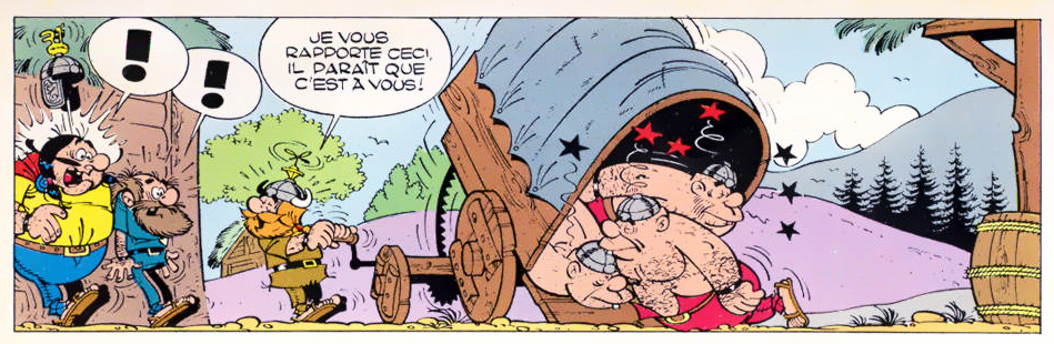 Instead, Remacle and Denis teamed up to create their own hero: the viking 'Hultrasson' (1964-1967). He was first introduced to readers in Spirou issue #1351 (5 March 1964). Characterized by a touch of fantasy and the same wacky humor as 'Le Vieux Nick', the series stars a viking in the service of King Harald-les-Beaux-Cheveux ("King Harald-with-the-Beautiful-Hairs"). Hultrasson is constantly crossed on his missions by the evil barbarian Sépadeffasson, who is destined to overthrow King Harald. Sépadeffasson's servant is the sly Payasson, whose looks were based on Spirou's editor-in-chief Yvan Delporte. To share the workload, the stories were penciled by Remacle and inked by Denis, while Vicq took care of the scriptwork for the episodes 'Fais-moi peur Viking' (1964) and 'Hultrasson chez les Scots' (1965). When the rather unreliable scriptwriter suddenly disappeared, Maurice Tillieux wrote the third story, 'Hultrasson perd le nord' (1966). In that same year, Remacle and Denis made two short spin-off stories starring Sépadeffasson. A temporary fall-out between the two artists ended their collaboration, and Remacle sold his share of the rights to publisher Dupuis. Denis made one more short story in 1967, but it took until 1973 before the series briefly returned. The fourth serial, 'L'Eau de Politesse', was once again scripted by Tillieux, but this time drawn by Vittorio Leonardo.