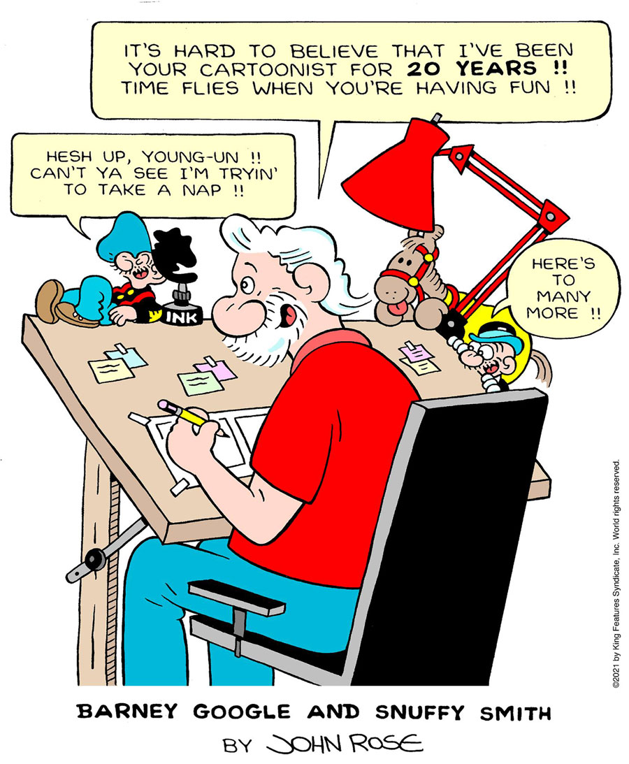 On Monday 17 June 2019, 'Barney Google and Snuffy Smith' celebrated its 100th anniversary. In the two weeks leading to the landmark event, John Rose and King Features Syndicate gave many notable characters from the strip's long run cameo appearances. Snuffy also had a run-in with characters from other long-running newspaper strips, such as Popeye and Blondie's Dagwood Bumstead.