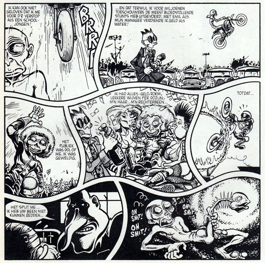 Initially embracing the atmosphere, freedom and relaxed attitude of the underground comics movement, Marcel Ruijters began his career in the Dutch alternative and small press comics scene of the 1980s. In 1984, his first contributions appeared in the indie comic magazine Coyote. When he couldn't find a publisher interested in publishing his offbeat work, he turned to self-publishing. Together with a couple of artist friends, he began the Monguzzi foundation, through which they produced, published and distributed their own Xerox-printed comic books. Between the late 1980s and early 1990s, Ruijters produced dozens of these DIY comic books, aimed at underground audiences both in the Netherlands and abroad. These included thirteen issues of the underground comic magazine Mandragoora (1987-1993), and seven issues of his 'Onbegrijpelijke Verhalen' series ("Incomprehensible stories", 1988-1992), featuring improvised stories with grotesque and surreal creatures.