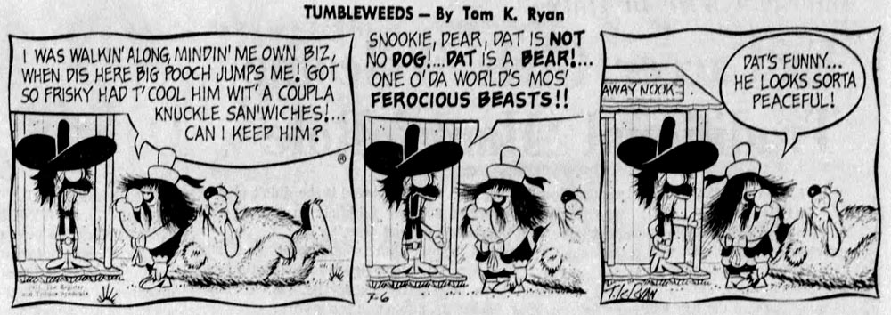Thomas K. Ryan was born in 1926 in Anderson, Indiana, and developed an early interest in drawing. He received basketball scholarships, but instead attended both Notre Dame University and the University of Cincinati. The young man held several odd jobs before venturing into commercial art, designing football helmets, but also drawing editorial and sports cartoons for local newspapers. Although largely self-taught, he took a correspondence course in art to finetune his skills. Out of boredom, he began reading western literature, and before he knew it, he was captivated by the tales of the Old West. As the genre was omnipresent at the time, Ryan got the idea to poke fun at all the western clichés and stereotypes in his own comic strip.