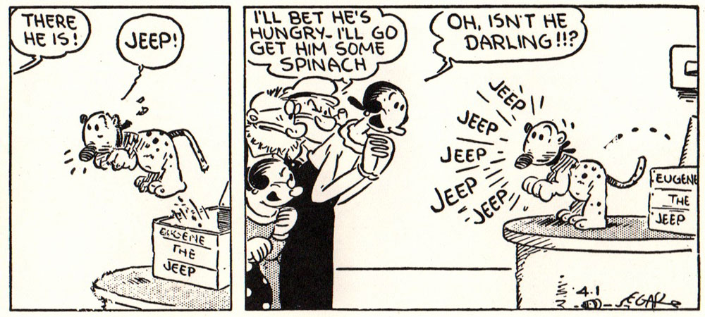 On 16 March 1936, perhaps the strangest creature in all of Segar's stories was delivered to Popeye's house as a gift from Olive's uncle: Eugene the Jeep. Eugene is a transmutation between an African Hooey Hound and a creature from the fourth dimension. The odd animal is capable of teleportation and can give the correct answer to any question. Wimpy takes advantage of Eugene by using him to predict gambling bets. Popeye and Olive treat Eugene as their pet, even though the animal is difficult to feed: it only eats orchids. Segar's final recurring character joined the cast on 25 October 1936, namely Poopdeck Pappy, Popeye's long-missing 99-year old father. Poopdeck is much tougher than his son, but also far less sympathetic. He doesn't like attention, pity or love. While Popeye is eager to reconcile with him, he simply wants to be let alone. Poopdeck is so grouchy that he doesn't mind beating Olive in her face if she irritates him.