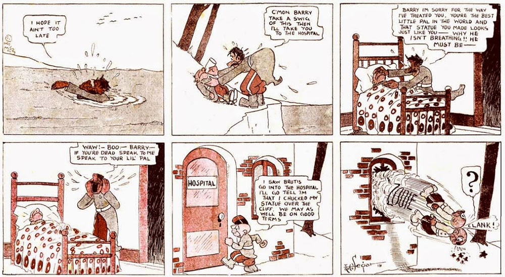 Segar's next gag comic, 'Barry the Boob' (1917-1918), took off on 23 September 1917. It stars two fools, reminiscent of Bud Fisher's 'Mutt & Jeff'. Barry is a tiny bald soldier whose nickname "boob" refers to a common expression at the time for "twit". His fellow recruit, Brutis, is tall, big-nosed and has a bushy mustache. While not very different from other comics at the time, Segar's artwork and comedic timing improved considerably. Still, on 28 April 1918, the series was terminated.