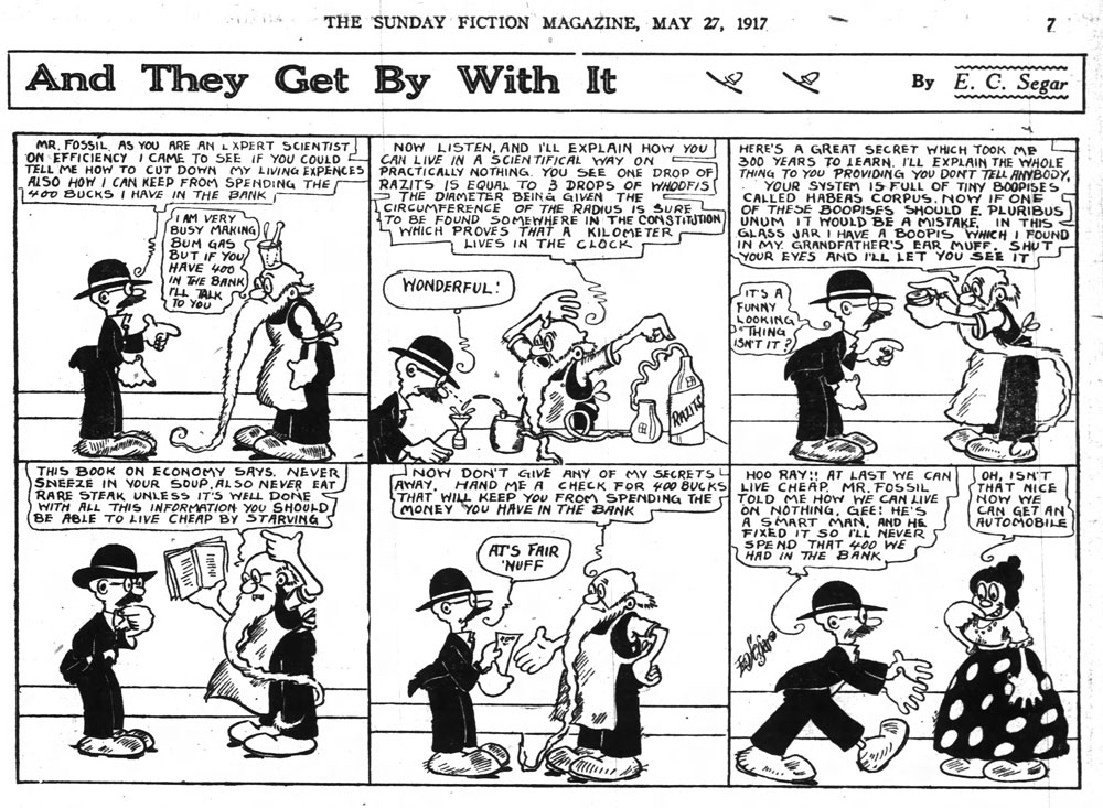 Between May and December 1917, Segar drew another gag-a-day comic titled 'And They Get By With It' / 'And They Get Away With It'. It stars a short, naïve man with a big nose and a mustache who was always fooled by the nonsense people told him. Very reliant on verbal comedy, it resulted in lengthy dialogue crammed in small speech balloons building up to the same punchline.
