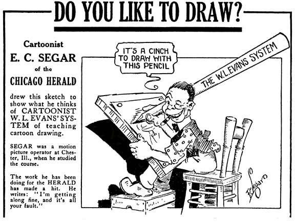 Elzie Crisler Segar was born in 1894 in Chester, Illinois. His name is pronounced "see-gar" and in adulthood he always made this clear to his readers by drawing a tiny little cigar next to his signature. His father was a Jewish handyman who worked as a house painter and wallpaper decorator. As a boy, Segar had an interest in photography, window dressing and playing drums. In the days of silent cinema, orchestras played live background music to the pictures. His hobby led to a job as drummer in the film theater Chester Opera House. Between performances, he sometimes went to the projection room and was eventually allowed to operate the camera himself. As he rewound the films for the next show, Segar made small-size cartoons which he snuck in movie frames as intermezzos between pictures. His main graphic influences were Richard Felton Outcault, George McManus, Frederick Burr Opper and George Herriman. Segar once tried to apply for a job as cartoonist in the St. Louis Dispatch, but was rejected. Realizing he had to improve his skills, he took a correspondence course in cartooning from W.L. Evans. By 1914 Segar moved to Chicago, where he was hired as cartoonist at the Chicago Herald, thanks to a recommendation by Outcault.